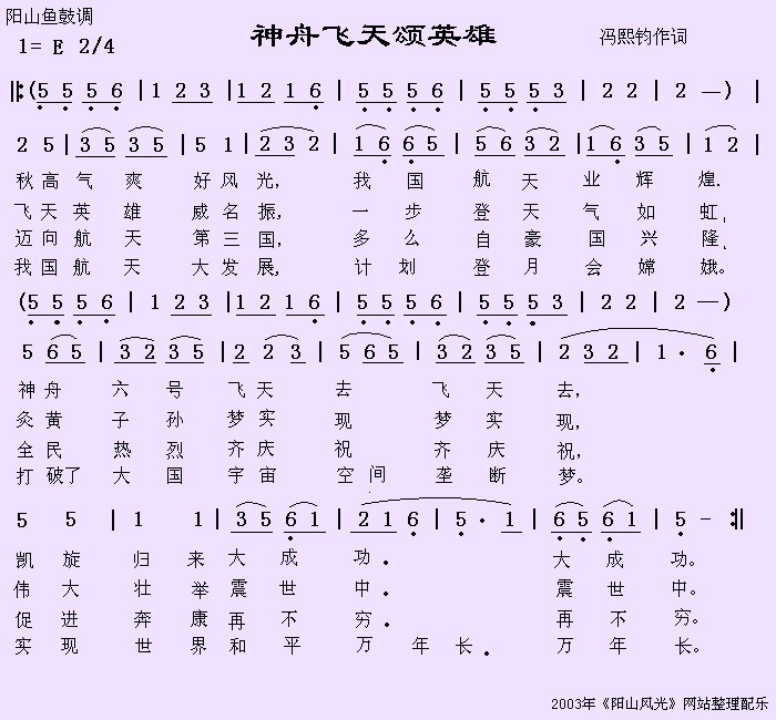 阳山鱼鼓调《神州飞天颂英雄》简谱(杨伟莹唱)_阳山风光_民间音乐室_